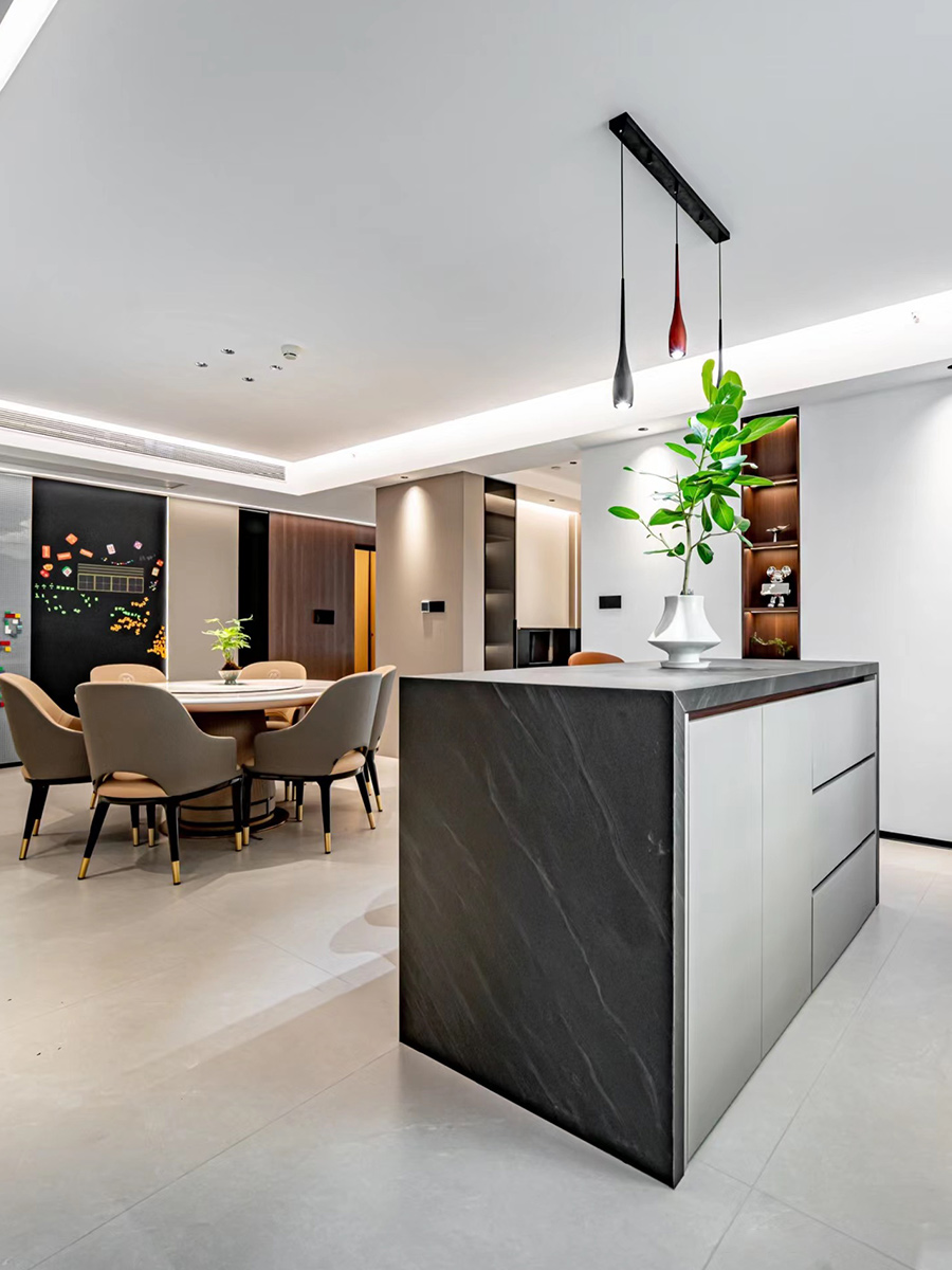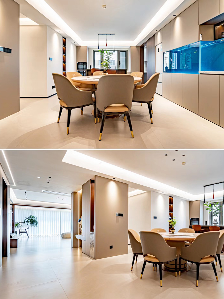餐廳—島臺—西廚—中廚,功能分區(qū)明確,餐邊柜還留出魚缸造景區(qū)域,動線流暢。