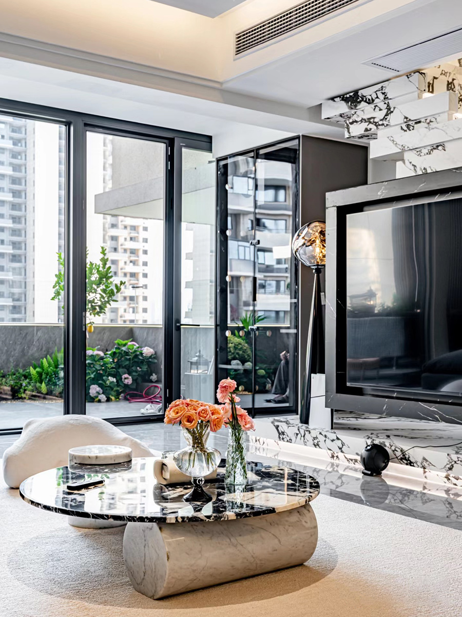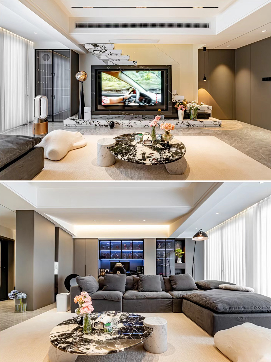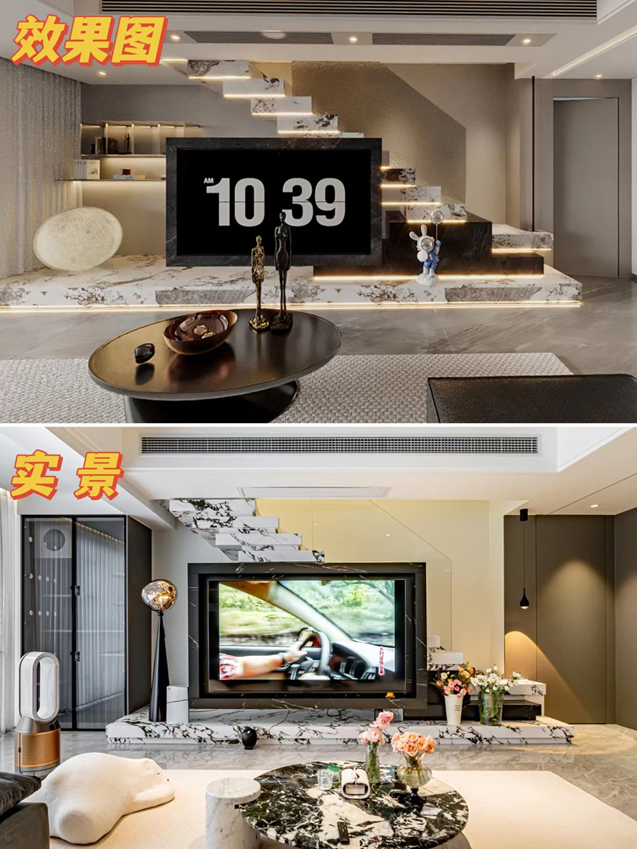 一字型巖板疊步樓梯+電視背景墻一體,仿佛置身雜志拍攝現(xiàn)場。