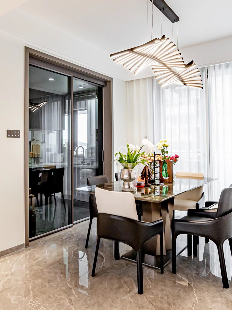 客廳、餐廳、生活陽臺聯(lián)通,全開放的公共區(qū)域在視覺更寬闊,動線上也非常便利。