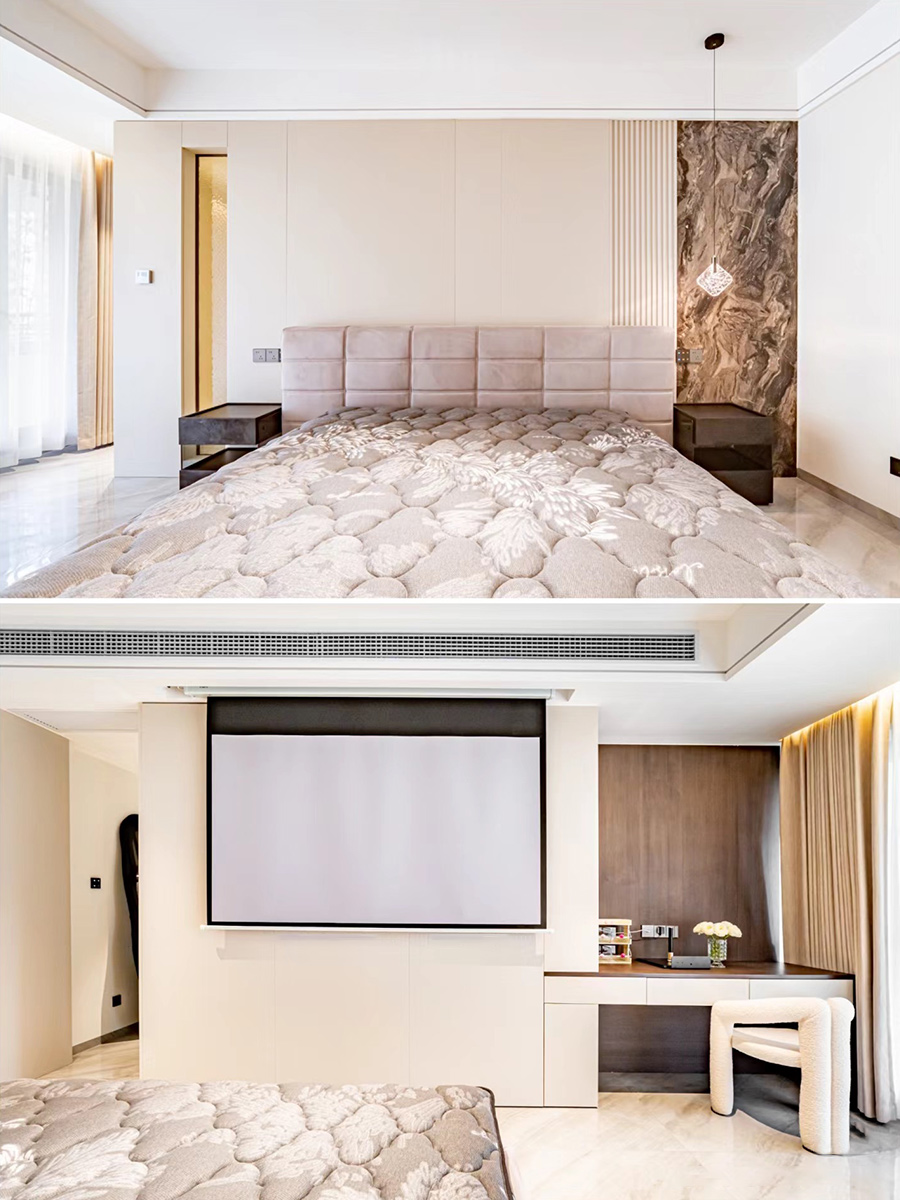 主臥做套房設(shè)計,利用衣帽間做隔墻,一邊做隱藏投影,穿插式一字型梳妝臺。