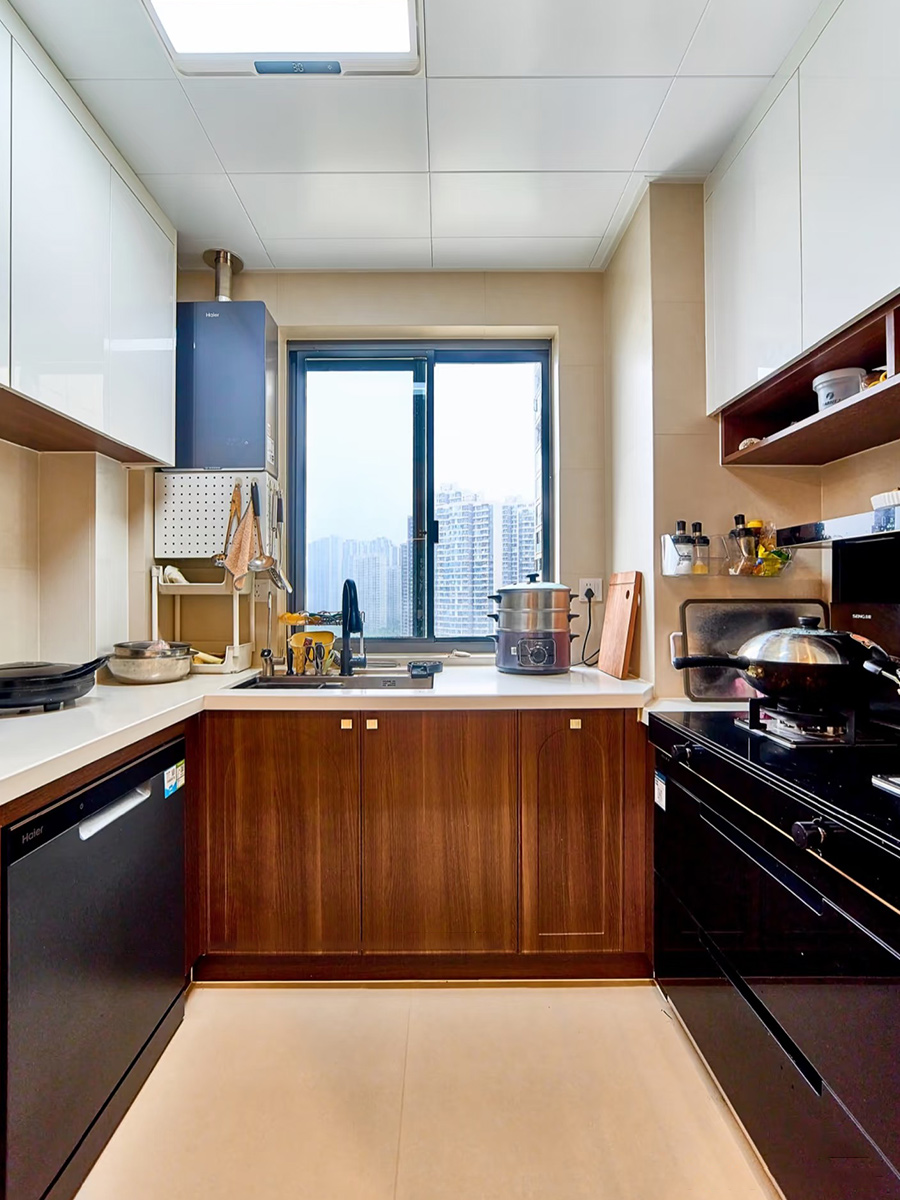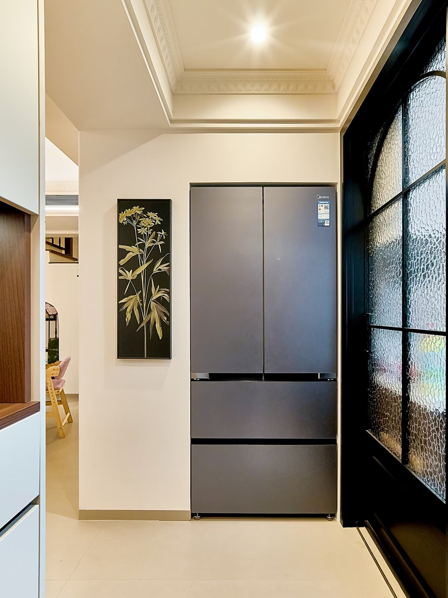 陽(yáng)臺(tái)大膽加入圓弧拱門(mén)和廚房黑色玻璃推拉門(mén),更加有復(fù)古調(diào)性