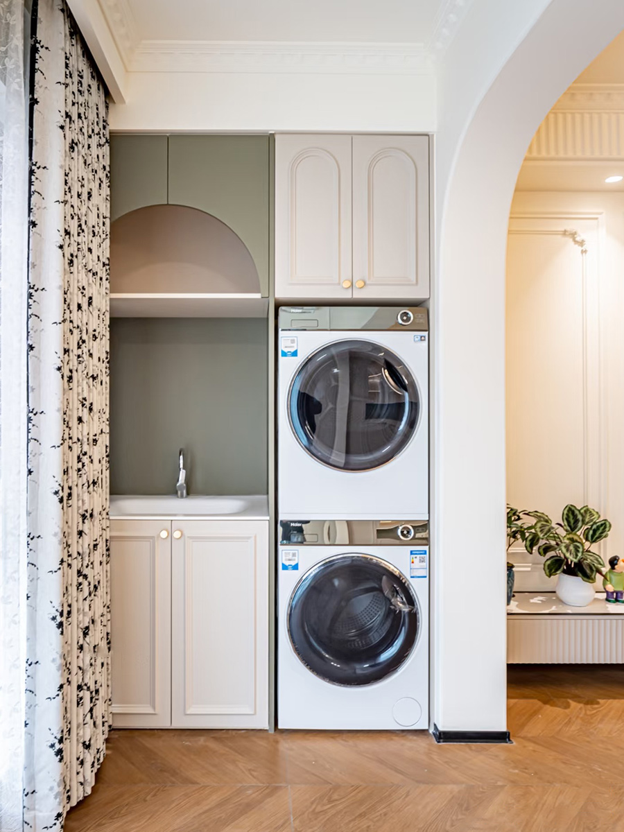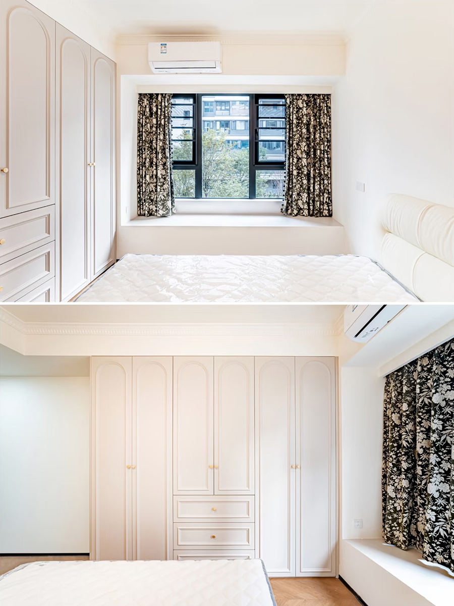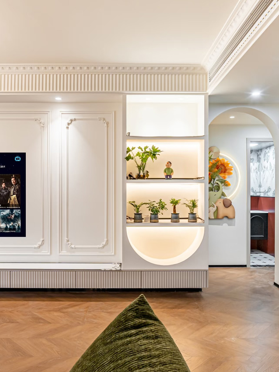 全房做弧形造型高端定制柜門,部分柜門搭配長虹玻璃、暖色燈帶,溫馨柔美。