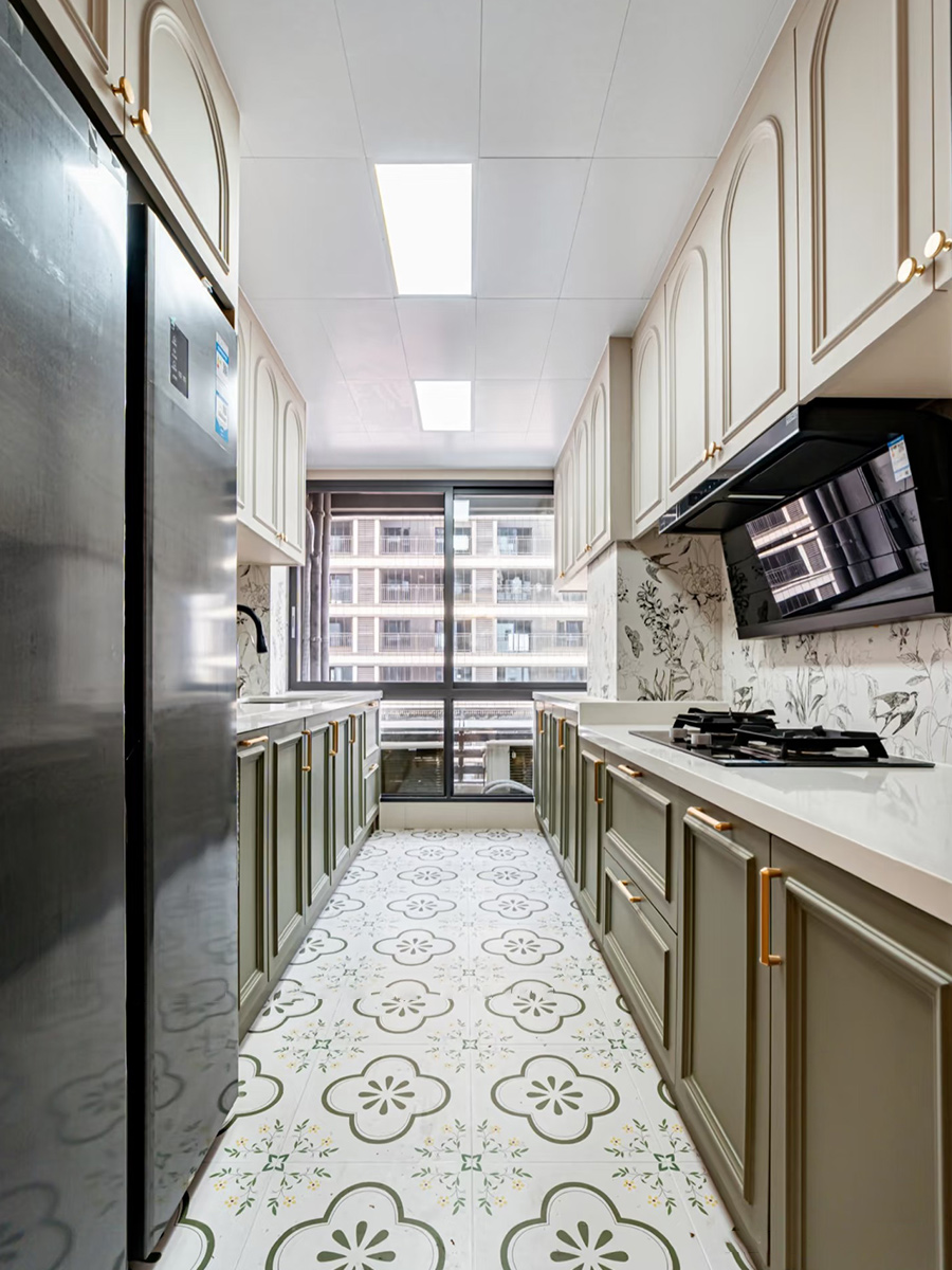 廚房推拉門圓弧造型黑色推拉門,電視背景墻、過道門洞戶型互相映襯。