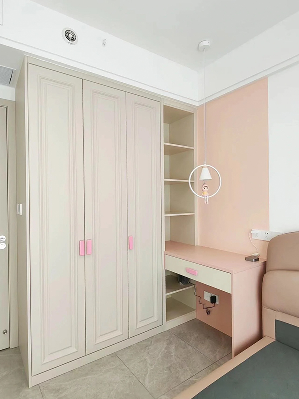 兒童房衣柜+裝飾柜+粉色轉(zhuǎn)角書桌,整個房間明亮溫暖,這一定是被爸爸媽媽寵著的小公舉??!