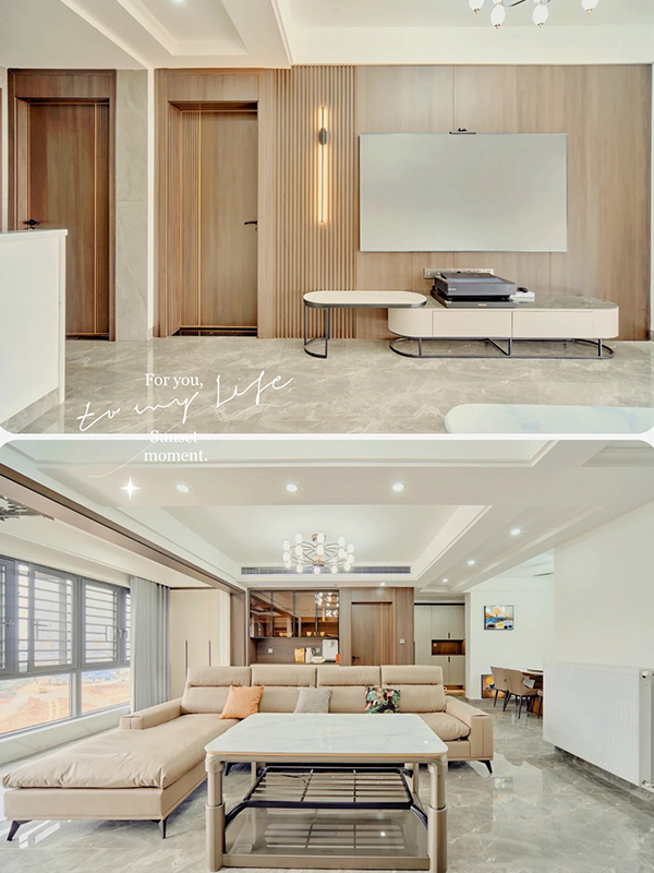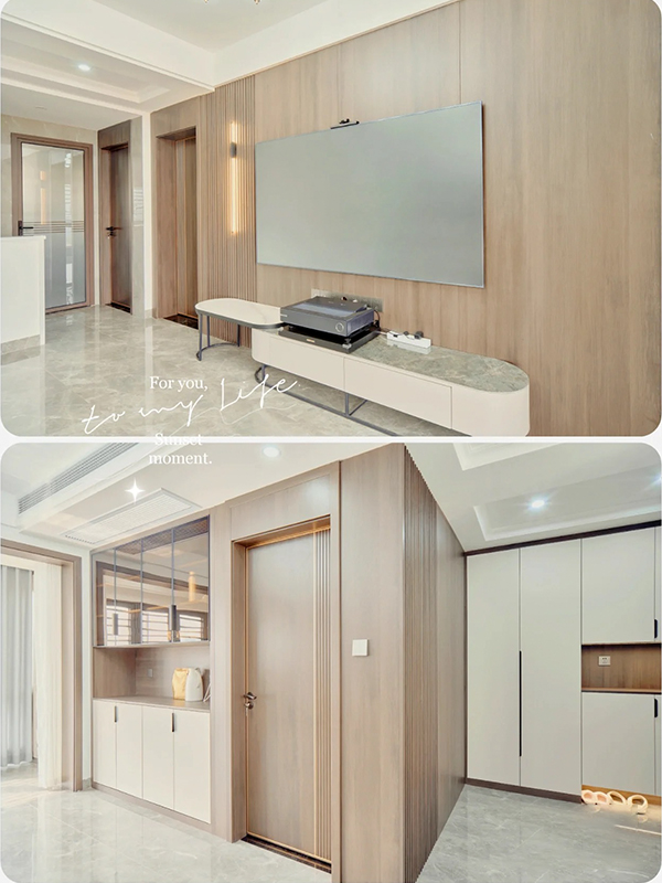 全屋多用木飾面元素,增加整體的格調(diào),柜子全房同款同色同造型,搭配燈帶等元素,瞬間拉高氛圍感,柔光瓷磚通鋪,明亮又顯大,視覺上更加干凈整潔