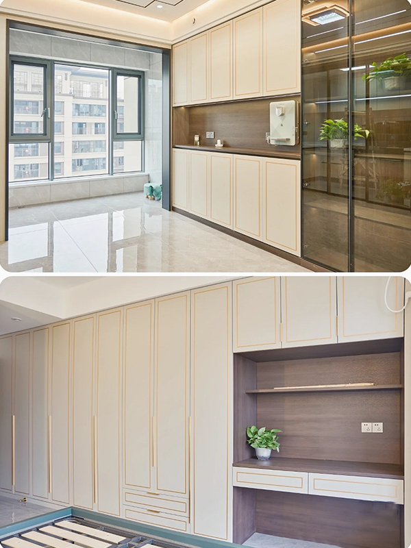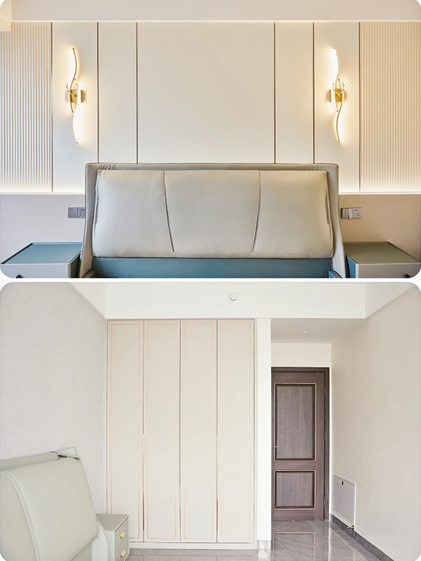 門(mén)墻柜一體化,象牙灰柜門(mén)鑲嵌金屬邊框,與柜門(mén)同款式,尤加利護(hù)墻板同色配套房門(mén)柜體更顯精致統(tǒng)一