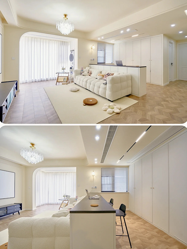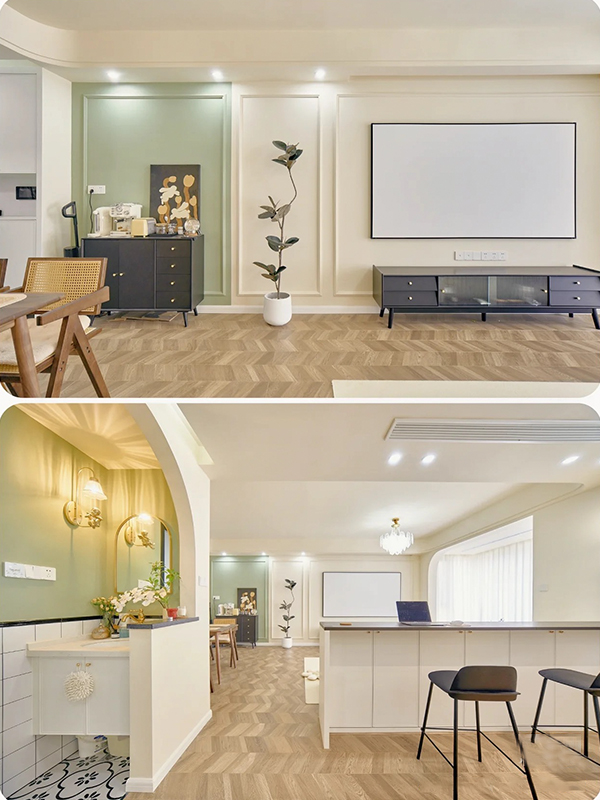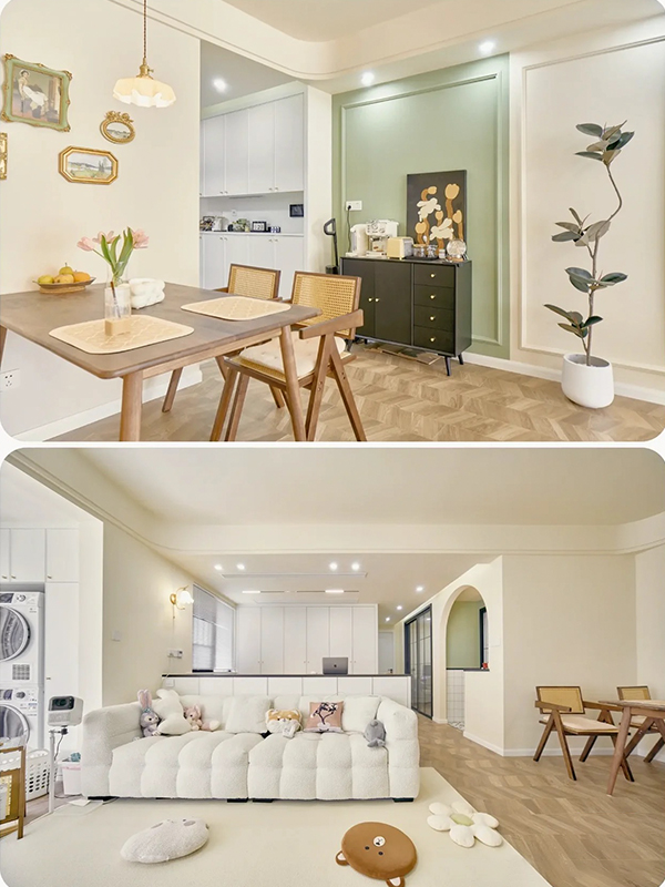 石膏線條鋪開,奶油色的墻面搭配人字拼地板,優(yōu)雅氣場滲透進整個空間,素凈的白色與牛油果綠在空間交匯,營造出優(yōu)雅的輕法式氛圍.