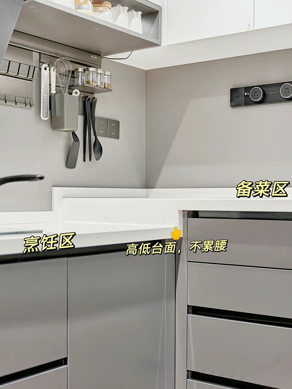 根據(jù)經(jīng)常下廚人的身高以及操作習(xí)慣做了高低臺面,洗菜、洗碗等不需要彎腰,炒菜的時候也不會累胳膊。