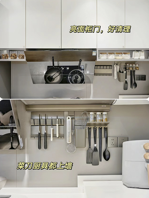 做亮面柜門不做膚感或復(fù)雜造型,真的節(jié)省了很多打掃工作。常用廚具都掛起來,隨用隨拿,不會堆放在臺面上。