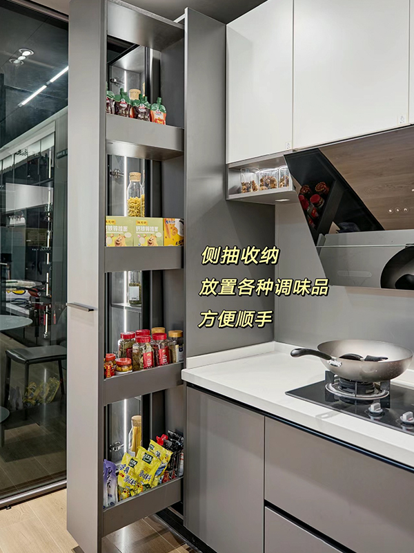 在烹飪區(qū)左手位置設(shè)置一個抽拉柜,各種調(diào)味品囤貨都可以整齊擺放在這里。拿取順手方便。備菜區(qū)臺盆留出位置放一個小推車,日常蔬果直接放這里也不占地方。